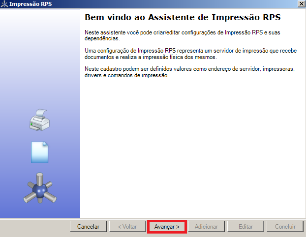 Passo 2: Clique no botão Adicionar para criar uma nova impressão RPS. A tela do Assistente de Impressão RPS será exibida, clique no botão Avançar para ir à próxima tela.