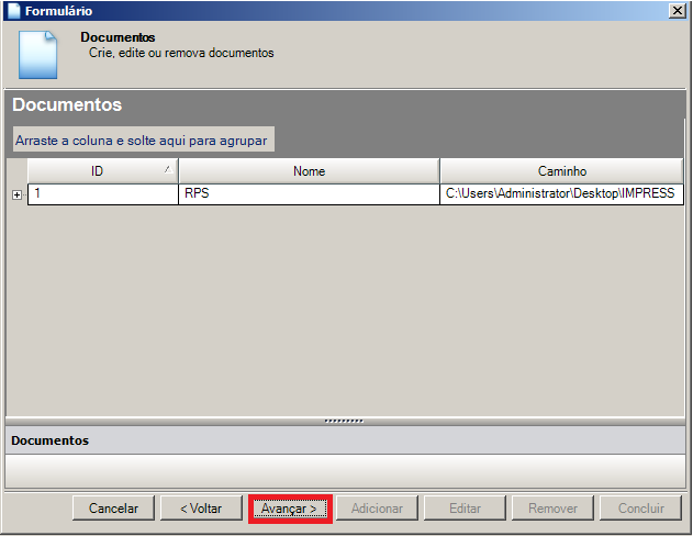 Passo 11: Na tela Documentos que está sendo exibida, selecione o documento RPS cadastrado, e clique no botão Avançar que é habilitado logo após a seleção.