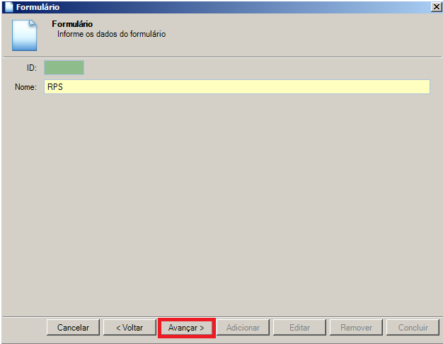 Passo 6: Na tela Formulário que é exibida, informe o nome do formulário no campo Nome. Após informar o nome, clique no botão Avançar que logo será habilitado.
