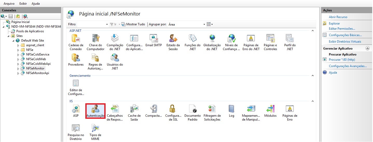 Passo 5: Acesse novamente o Internet Information Server (IIS) para dar permissão de autenticação ao site, clique sobre NFSeMonitor.