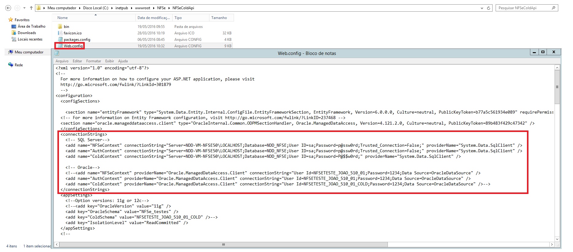 <connectionStrings> <add name="NFSeContext" connectionString="Server=TESTES\sqlexpress;Database=NDD_NFSE;User ID=sa;Password=P@$$w0rd;Trusted_Connection=False;" providerName="System.Data.SqlClient" /> <add name="AuthContext" connectionString="Server=TESTES\sqlexpress;Database=NDD_NFSE;User ID=sa;Password=P@$$w0rd;Trusted_Connection=False;" providerName="System.Data.SqlClient" /> <add name="ColdContext" connectionString="Server=TESTES\sqlexpress;Database=NDD_NFSE_COLD;User ID=sa;Password=P@$$w0rd;Trusted_Connection=False;" providerName="System.Data.SqlClient" />