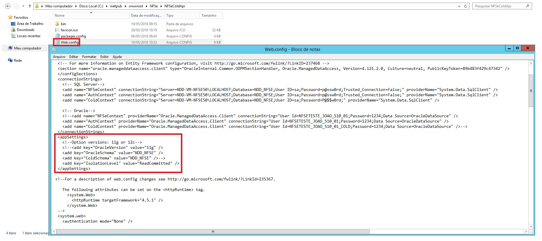 Passo 2: No mesmo diretório C:\inetpub\wwwroot\NFSe\NFSeColdWebAPI no arquivo web.Config localize a tag <appSettings>, verifique se as linhas OracleVersion, OracleSchema e ColdSchema estão comentadas. Essas linhas são exclusivas para uso do banco oracle, por padrão na instalação do NFS-e essas linhas já constarão comentadas, será necessário descomentar se estiver utilizando o banco oracle. Caso deseje configurar o banco de dados oracle siga as instruções do link: Configurações NFS-e e-ColdWeb banco Oracle