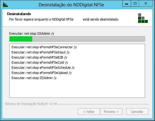 Passo 3: Progresso da desinstalação, será mostrado o progresso da desinstalação do NDDigital NFS-e, durante está etapa também serão removidos os pré-requisitos selecionados anteriormente.