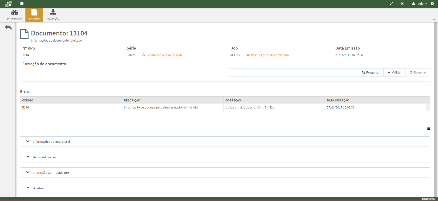 Quando acesso a tela de corrigir, é apresentado a informação do erro de negócio que foi gerado pelo webservice da prefeitura, conforme apresentado abaixo: