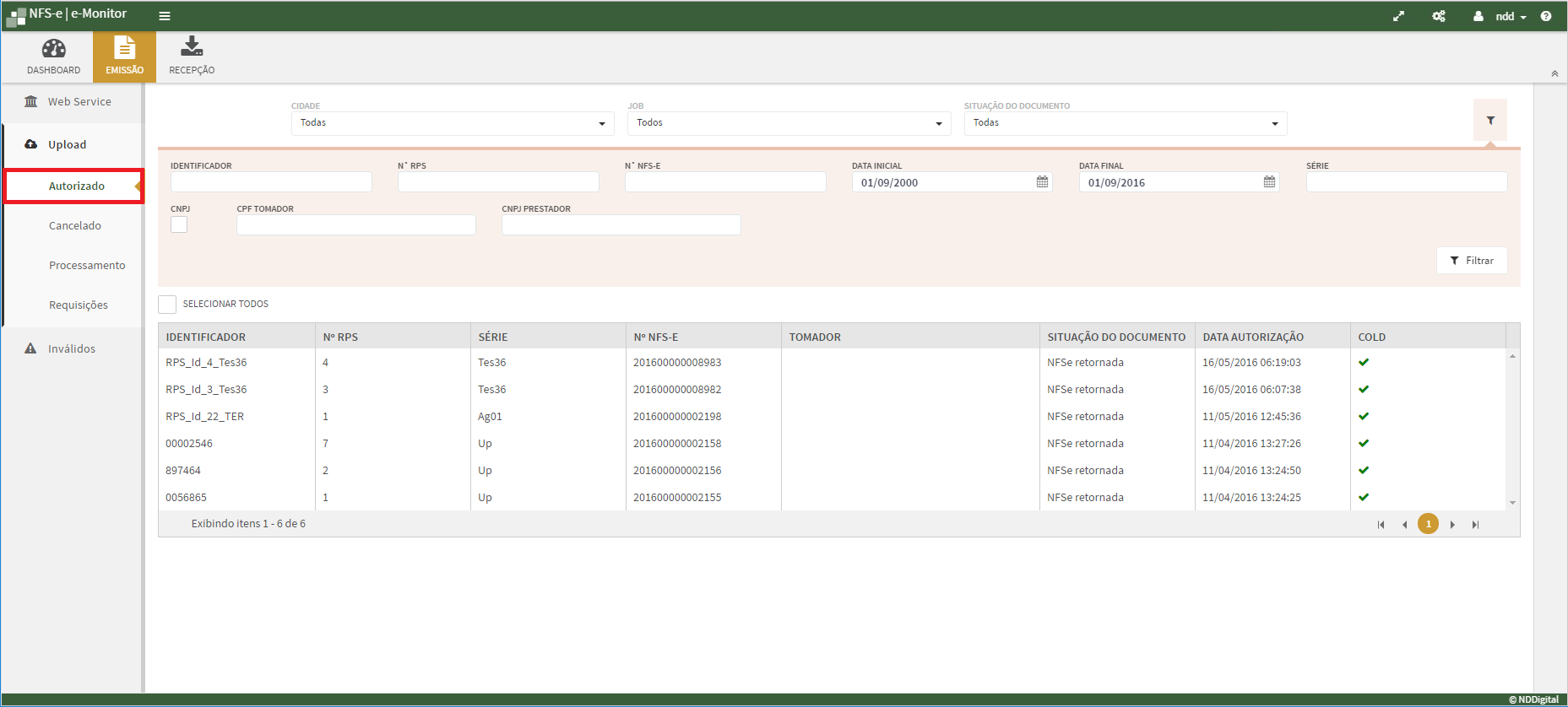 Na aba Autorizado é possível visualizar os documentos, os Detalhes do documento processados via Upload que foram autorizados pela prefeitura. É possível também realizar a exportação do Documento Original, XML de RPS e XML NFS-e.