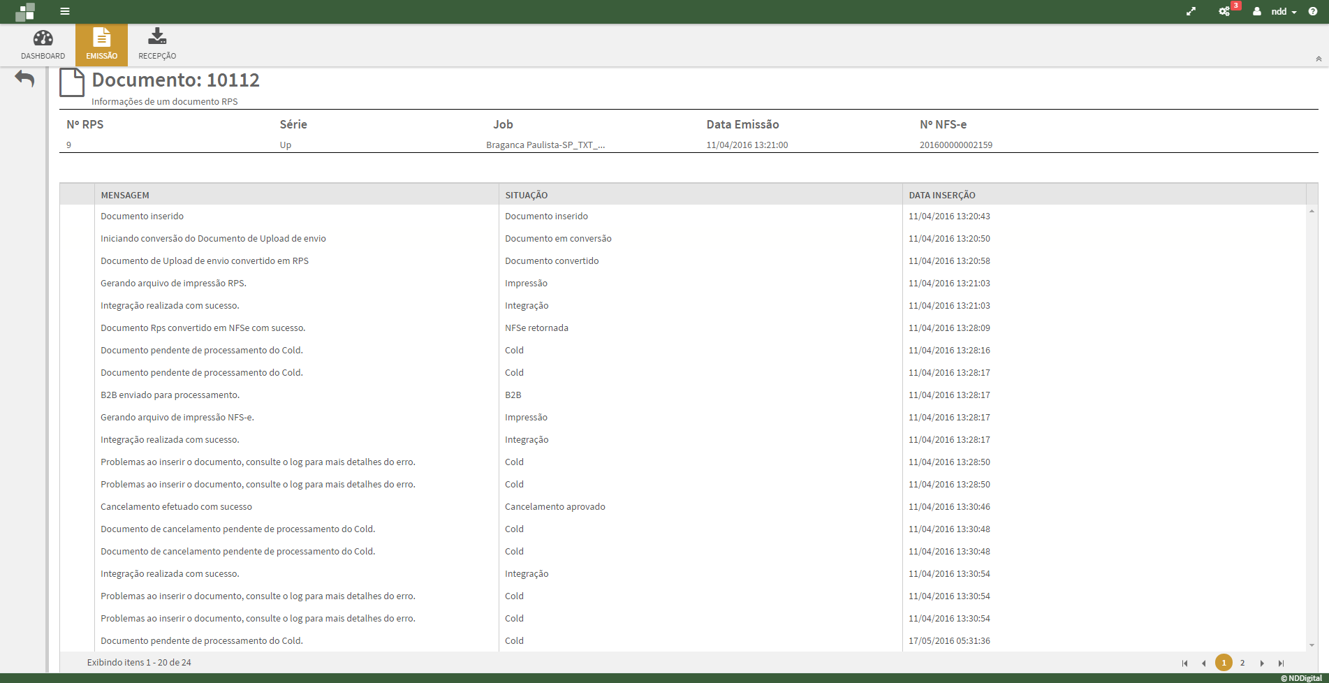 Na tela Detalhes é informado os dados do documento detalhadamente, entre seus dados os passos do processamento do documento até o status final do documento.
