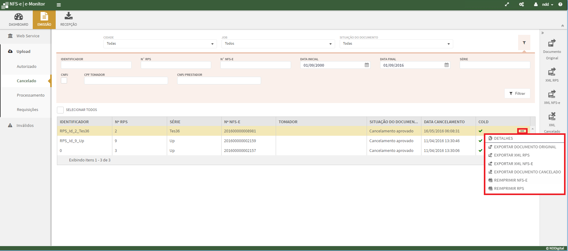 Para visualizar os Detalhes do documento, exportar Documento original, XML RPS, XML NFS-e e Exportar Documento Cancelado, realizar a impressão de Reimprimir RPS e Reimprimir NFS-e individualmente selecione o registro no grid e clique sobre reticências(...), localizado no final da linha na coluna do Cold.