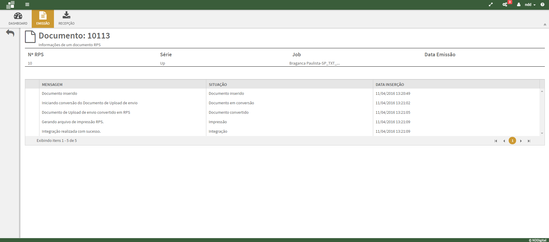 Na tela Detalhes é informado os dados do documento detalhadamente, entre seus dados os passos do processamento do documento até o status final do documento.