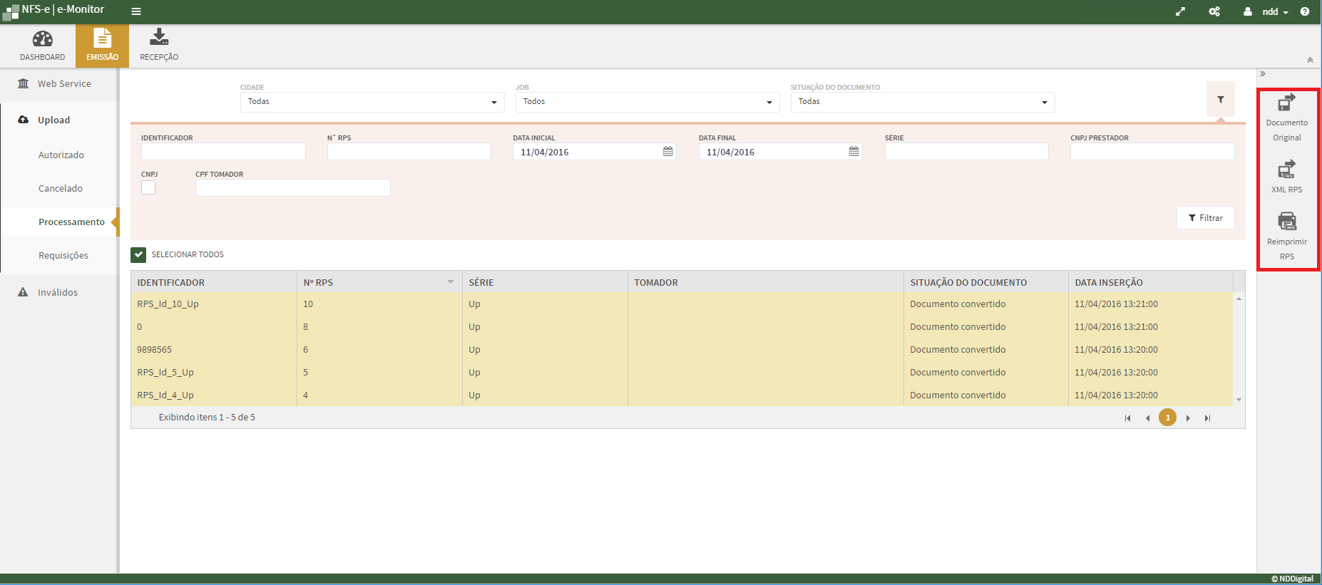 Na aba Processamento são exibidos todos os processos que estão sendo executados ou pendentes. É possível também realizar a exportação do Documento Original.