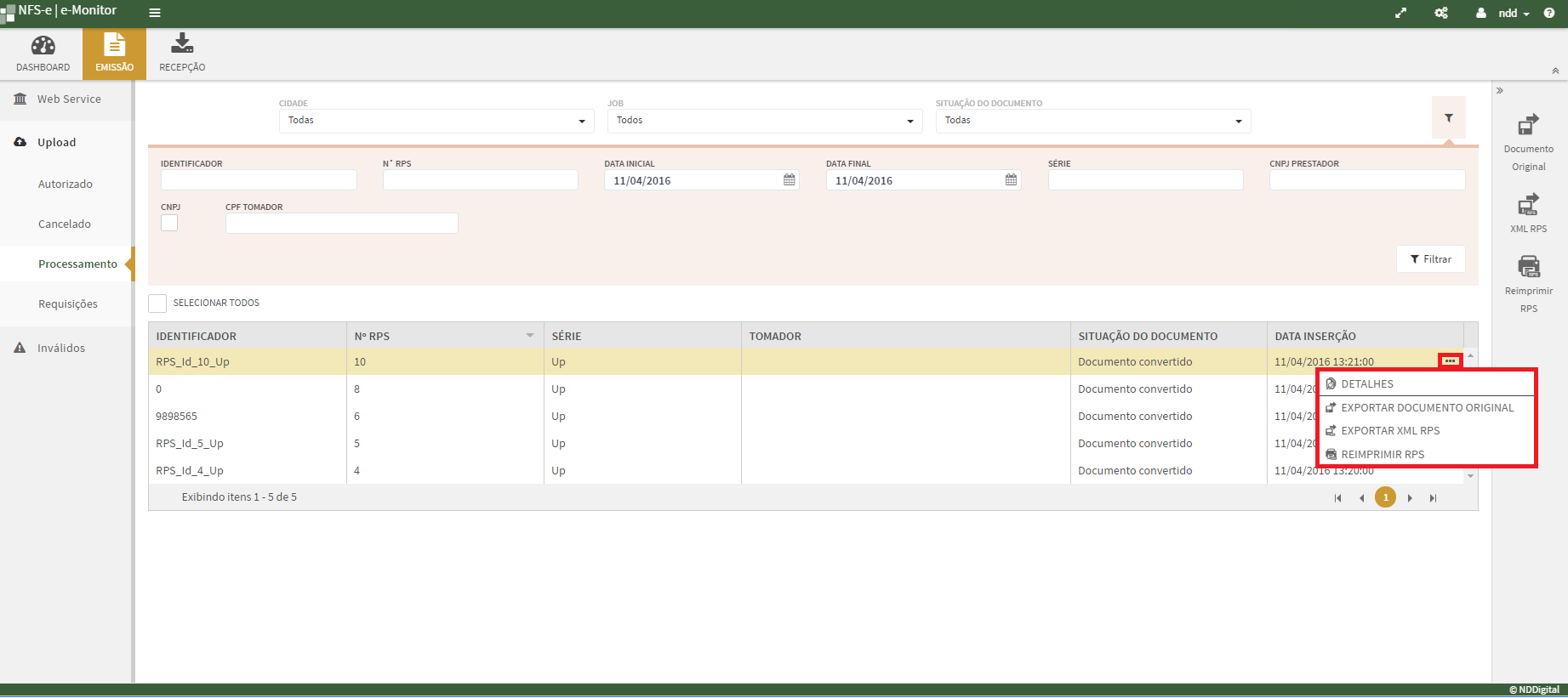 Para visualizar os Detalhes do documento, exportar Documento original e XML RPS, realizar a impressão de Reimprimir RPS individualmente selecione o registro no grid e clique sobre reticências(...), localizado no final da linha na coluna data inserção.
