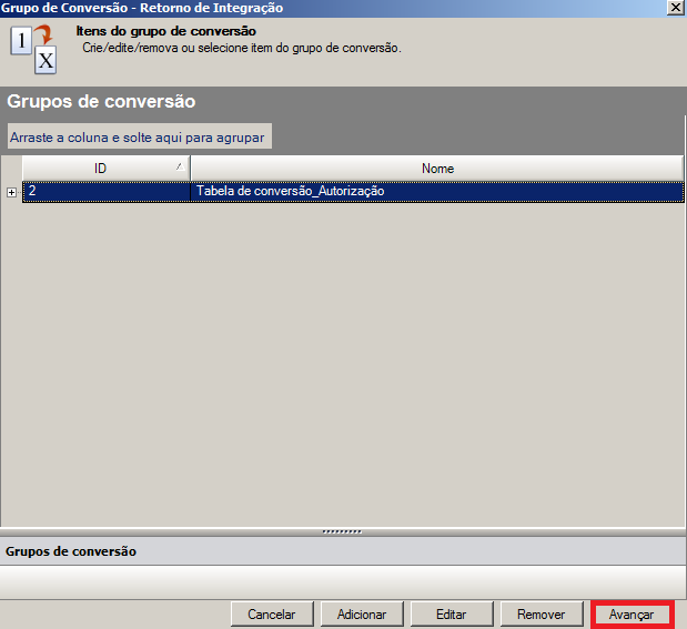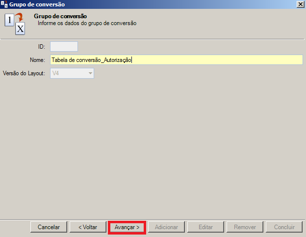 D.Na tela tela assistente de grupo de conversão, clique em Avançar para dar continuidade na configuração da tabela de conversão de integração.