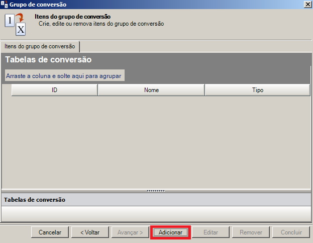I.Na tela itens do grupo de conversão, clique em Adicionar para dar continuidade na nova tabela.