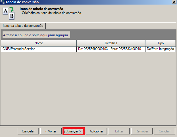Q.Na tela grupo de conversão, selecione a tabela desejada e clique em Avançar para finalizar as configurações da tabela.