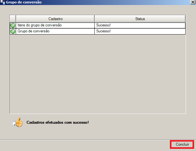 P.Na tela tabela de conversão é apresentado o cadastro das configurações que foi realizado com sucesso, para finalizar basta clicar em Concluir.