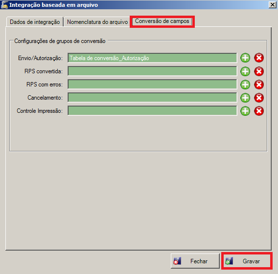 •Adicionar: Possibilita criar uma nova tabela de conversão de integração.