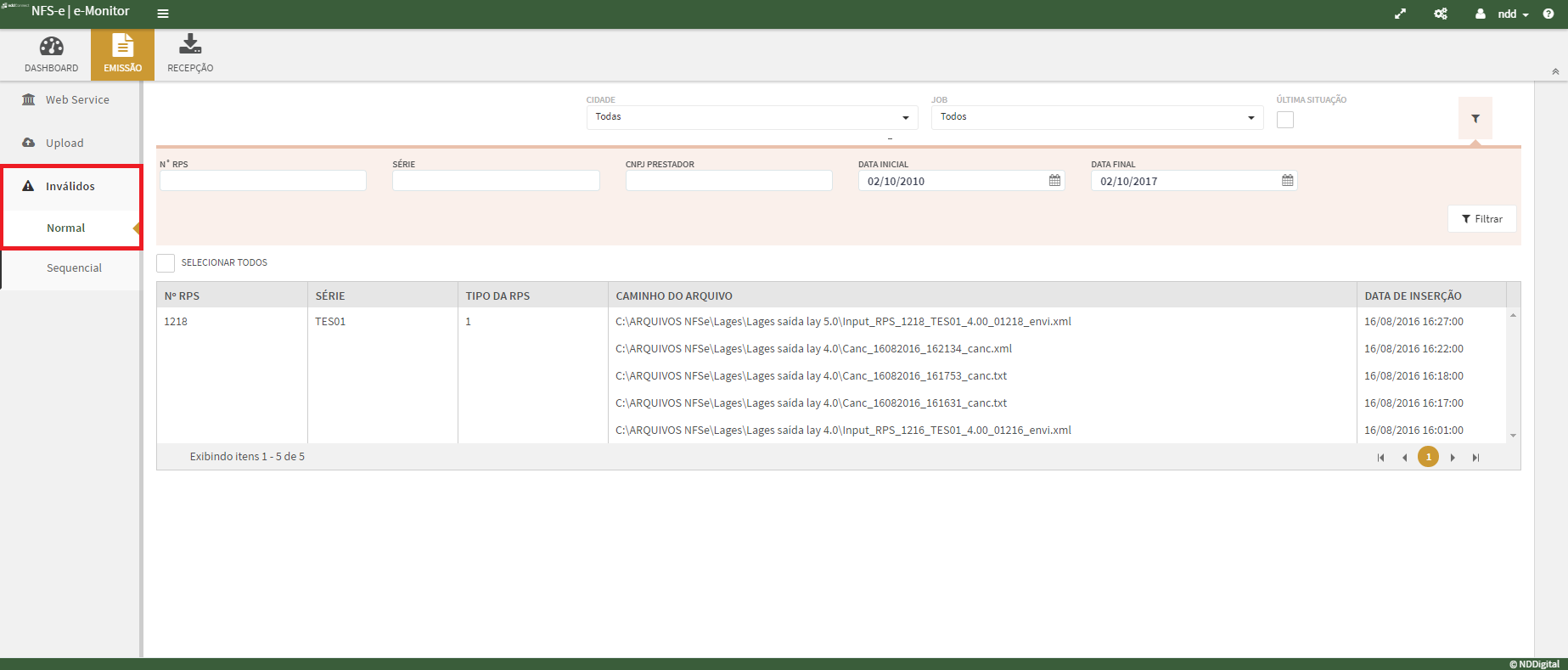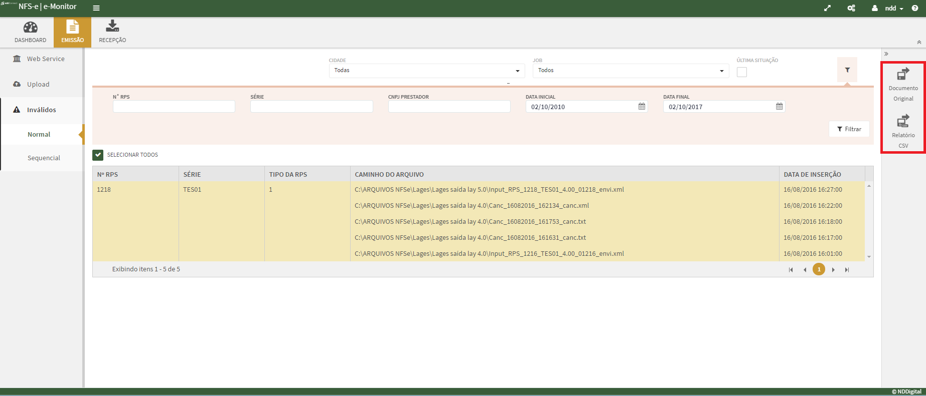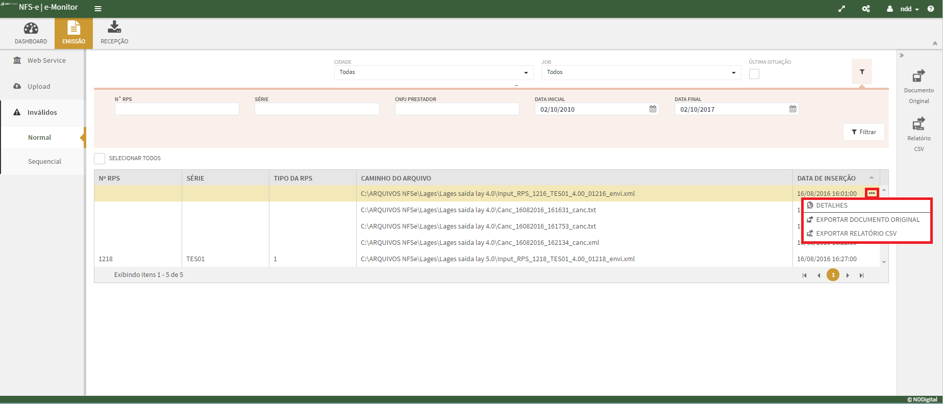 Neste menu será informado os documentos inválidos normal, será possível realizar a exportação do Documento Original, relatório CSV e visualizar detalhes do documento.
