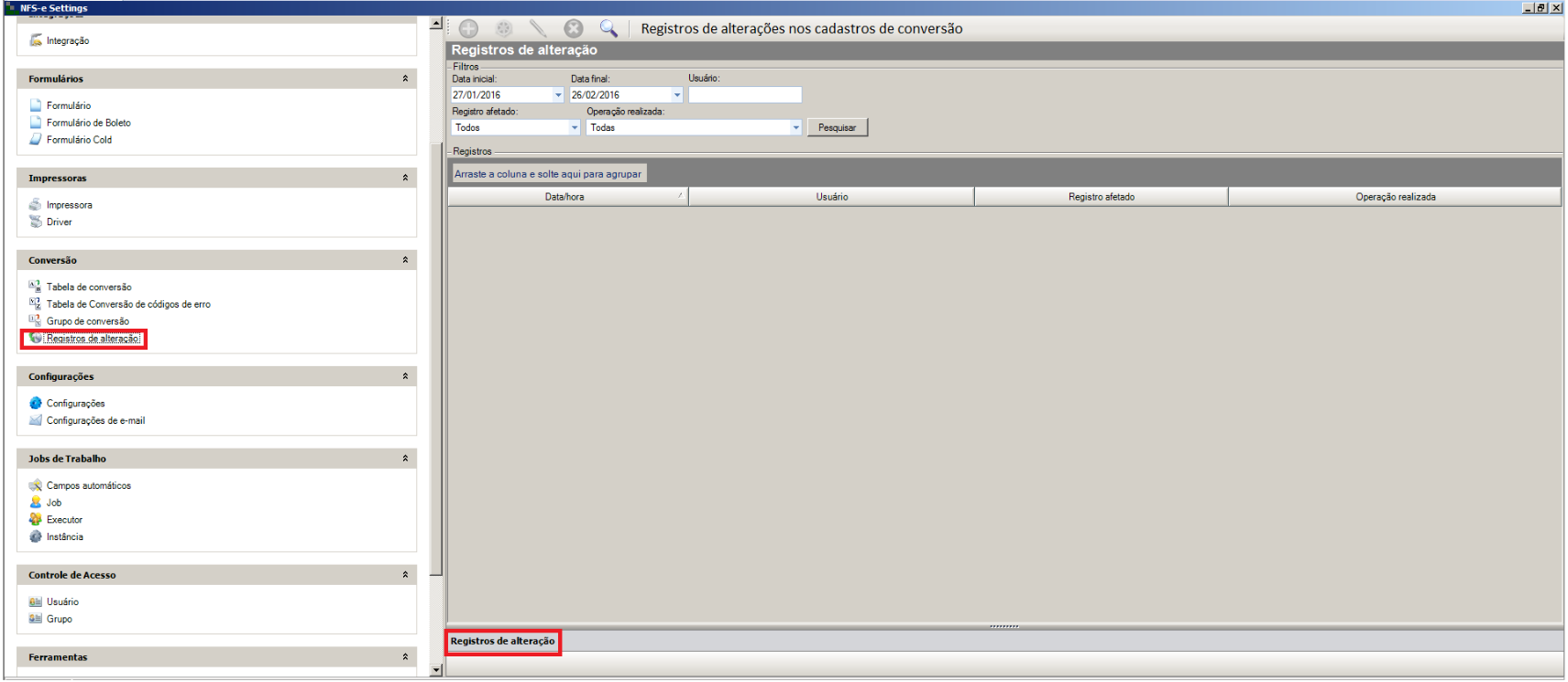 Passo 1: Clique na opção Conversão > Registro de Alteração, no menu à esquerda da interface do NFS-e Settings e em seguida na opção Registro de Alteração localizada na parte inferior da interface do NFS-e Settings. A figura abaixo ilustra a interface do NFS-e Settings com as opções destacadas.