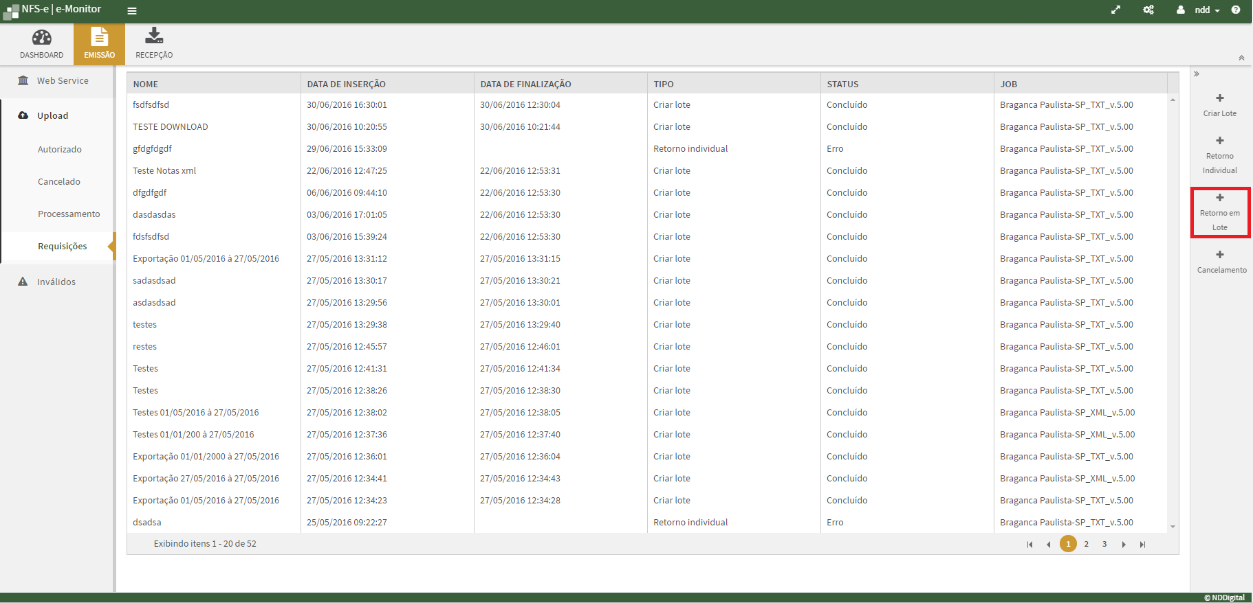 Passo 1: Para criar uma requisição de retorno clique em Retorno em Lote. É utilizada para inserir retornos em lote que são retornados pelo site da prefeitura.