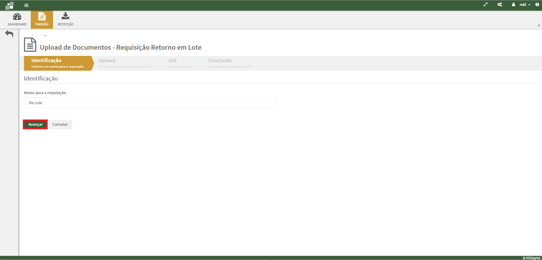 Passo 2: Na tela "Retorno em Lote aba Identificação" que está sendo apresentado informe no campo Nome a identificação desejada. Em seguida clique em Avançar.