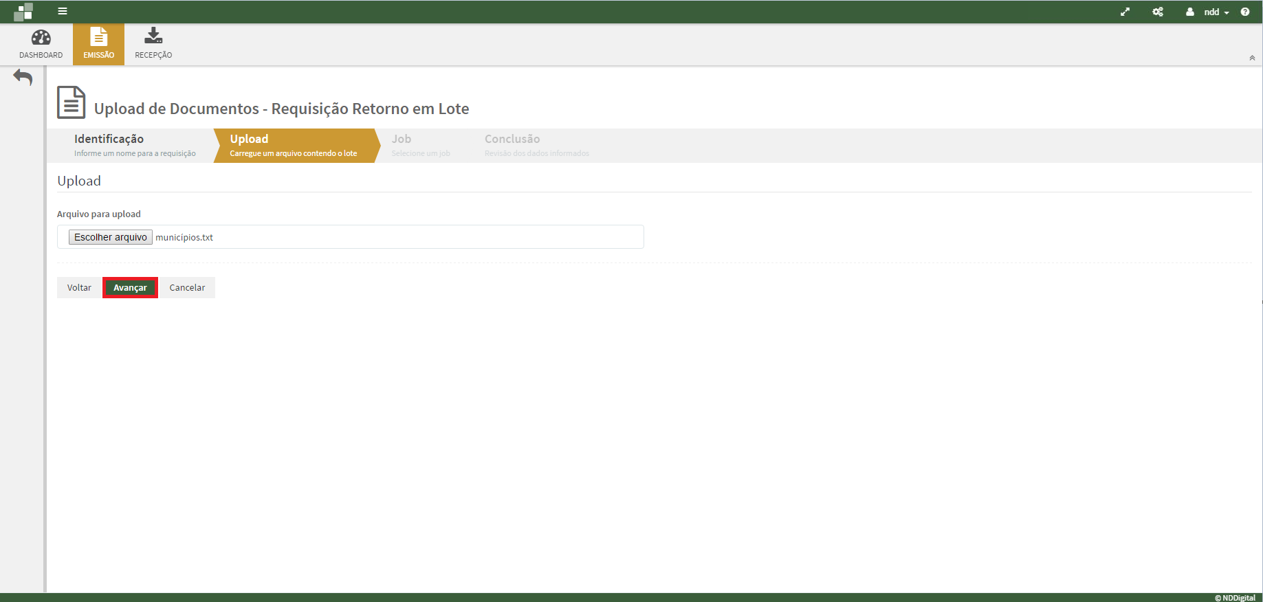 Passo 3: Na tela "Retorno em Lote aba Upload" selecione um arquivo com a extensão .TXT ou .XML contendo nota através do botão Escolher arquivo. Em seguida clique em Avançar.