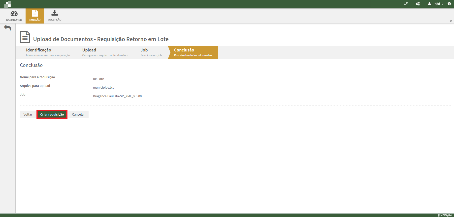 Passo 5: Na tela "Retorno em Lote aba Conclusão" que está sendo apresentado confira os dados da solicitação de requisição, em seguida clique em criar requisição.