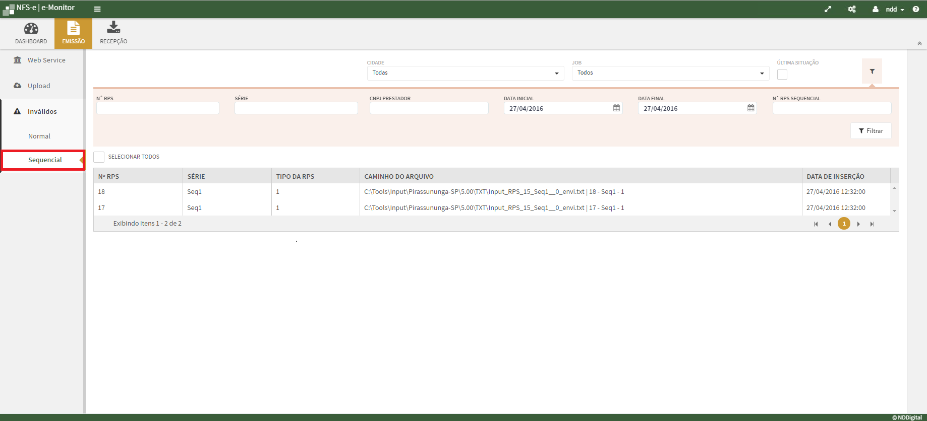 Documentos Inválidos Sequencial possui os seguintes filtros: |