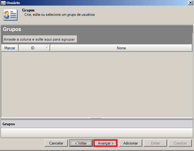 Passo 4: Clique no botão Adicionar se desejar cadastrar um Grupo de acesso (Grupos contém Jobs permitidos em seu cadastro), caso contrário, clique no botão Avançar. Caso deseje cadastrar um Grupo siga os passos no link: Grupo.
