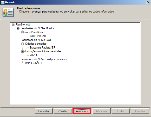Passo 7: Na tela apresentada confira os dados configurados, em seguida clique no botão Avançar.