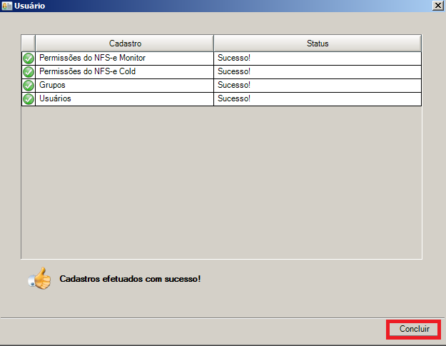 Passo 8: Na tela apresentada exibirá a mensagem "Cadastros efetuados com sucesso!", clique no botão Concluir e o cadastro do usuário será confirmado.