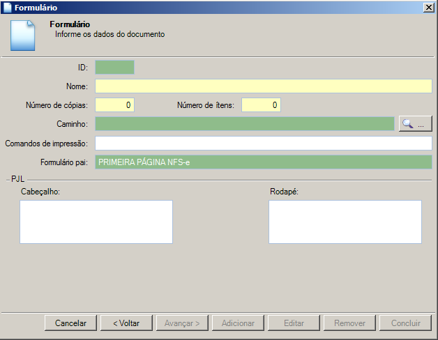 H. O campo Rodapé é utilizado para informar os comandos PJL da impressora para rodapé de página.