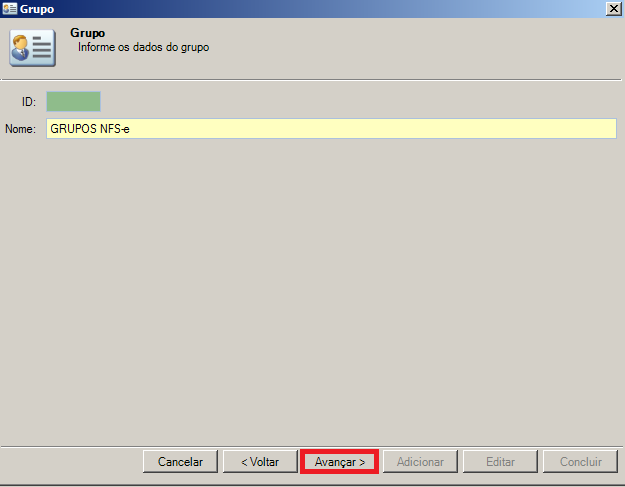 Passo 3: No campo Nome, informe o nome a ser utilizado para identificar o grupo que está sendo cadastrado em seguida clique no botão Avançar.