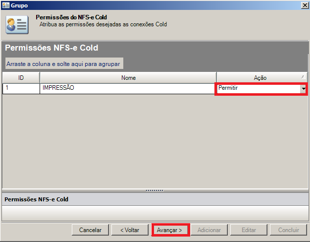 Passo 5: Na tela permissões do NFS-e cold, na coluna ação selecione Permitir, para que o Job seja apresentado no portal NFS-e e-ColdWeb. Clique no botão Avançar para confirmar as permissões.