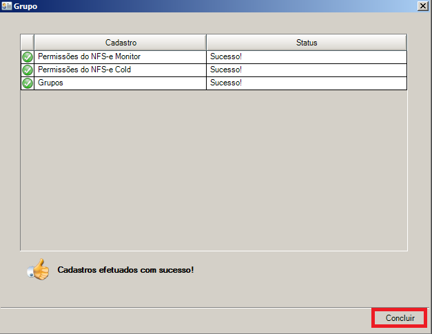 Passo 7: Na tela apresentada será exibida a mensagem "Cadastros efetuados com sucesso!", clique no botão Concluir e o cadastro do grupo será confirmado.