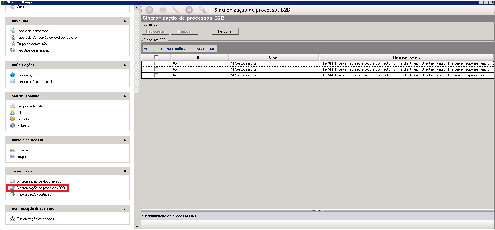 Para reprocessar um processo B2B basta selecionar um ou mais registros e clicar no botão “Reprocessar”. Para remover um processo B2B basta selecionar um ou mais registros e clicar no botão “Remover”.