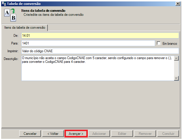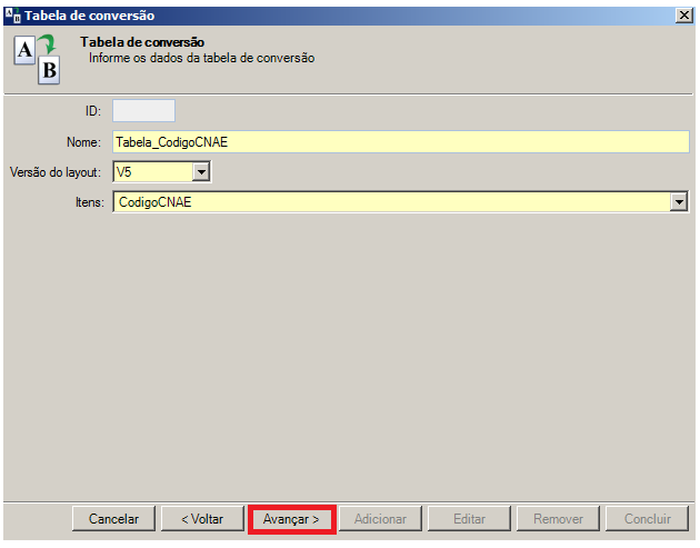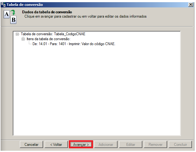 Passo 7: Na tela dados da tabela de conversão, consta os dados das configurações realizados, confira se as informações estão corretas e clique no botão Avançar, para dar continuidade na configuração da tabela.