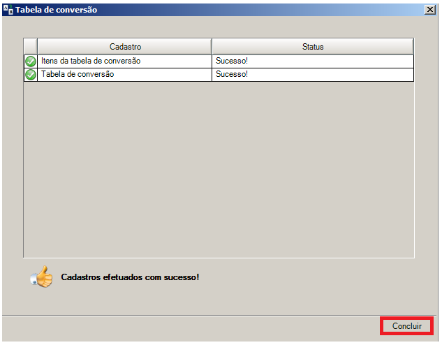 Passo 8: Na tela tabela de conversão é apresentado o cadastro das configurações que foi realizado com sucesso, para finalizar basta clicar no botão Concluir.