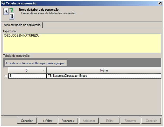 A.Deverá ser informado no campo Expressão quais expressões serão utilizadas para a concatenação. As expressões deverão ser informadas entre Colchetes “[]” e concatenadas com o operador “+”. Após preencher a expressão, selecione uma tabela de conversão para a expressão.