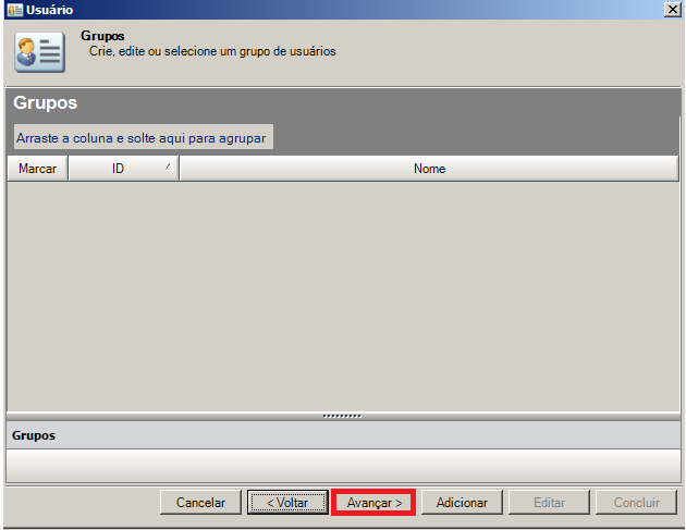 Passo 4: Clique no botão Adicionar se desejar cadastrar um Grupo de acesso (Grupos contém Jobs permitidos em seu cadastro), caso contrário, clique no botão Avançar.