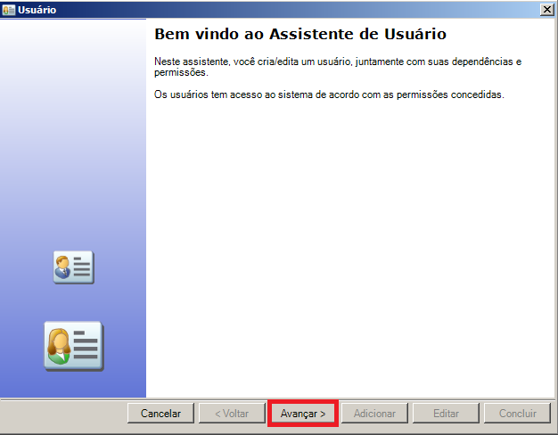 Passo 2: Clique no botão Adicionar para criar um novo usuário. A tela do Assistente de Usuário será exibida, clique no botão Avançar para ir à próxima tela.