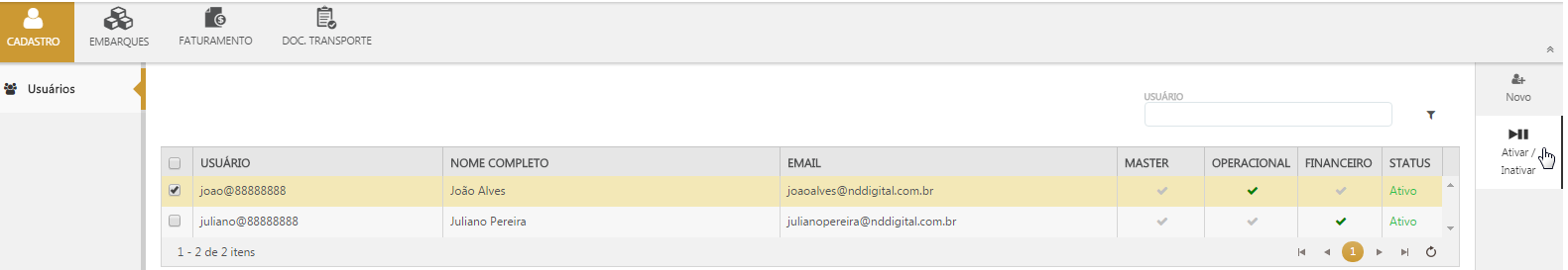 A solução não permite a exclusão dos usuários, portanto para bloquear o acesso dos usuários com os perfis Operacional e Financeiro ao Portal do Transportador é necessário inativá-los. Para isso, os usuários devem ser selecionados através da tela de cadastro com a listagem dos mesmos e inativá-los pela ação Ativar/Inativar.