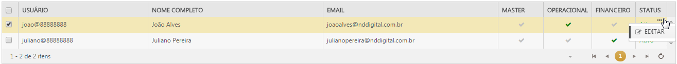 Através da opção Editar, presente no botão de ações do registro de cada usuário, é possível ter acesso às informações dos usuários.