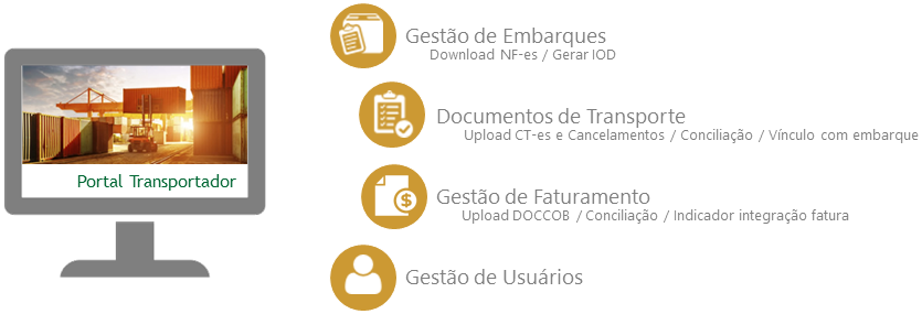 O Portal do Transportador reúne informações de todas as empresas de um grupo, sejam elas filiais de uma matriz ou matrizes com suas respectivas filiais. Estas informações são exibidas conforme as permissões dos transportadores e embarcadores vinculados aos usuários, ou seja, são restritas por usuários, os quais são gerenciados pelo usuário master do grupo de empresas. Através do Portal do Transportador, é possível acompanhar todos os documentos de transporte, embarques e faturamento. Com base no embarque, o usuário tem acesso às demais informações:
