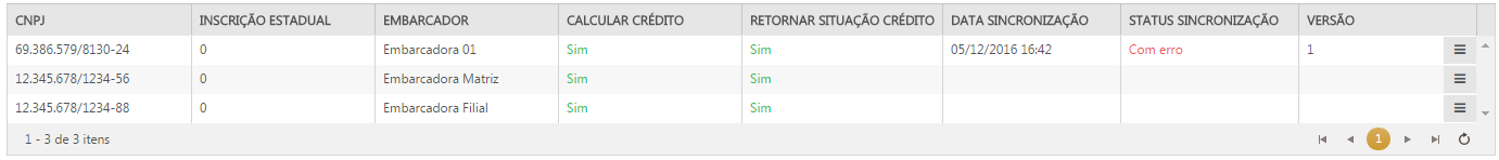 •Sincronizado: Significa que os dados informados na configuração do crédito tributário, foram enviados e cadastrados com sucesso no módulo de crédito tributário. A partir desta sincronização, os CT-es recepcionados e conciliados são disponibilizados para o cálculo do crédito. Com o crédito sobre a operação calculado, os CT-es podem ser incluídos em faturas;