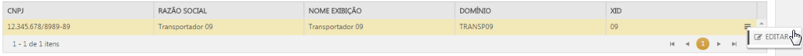 Para editar um transportador, deve ser acessado a tela de transportadores cadastrados e selecionar o transportador desejado, onde será apresentado o botão Editar, conforme exemplo abaixo: