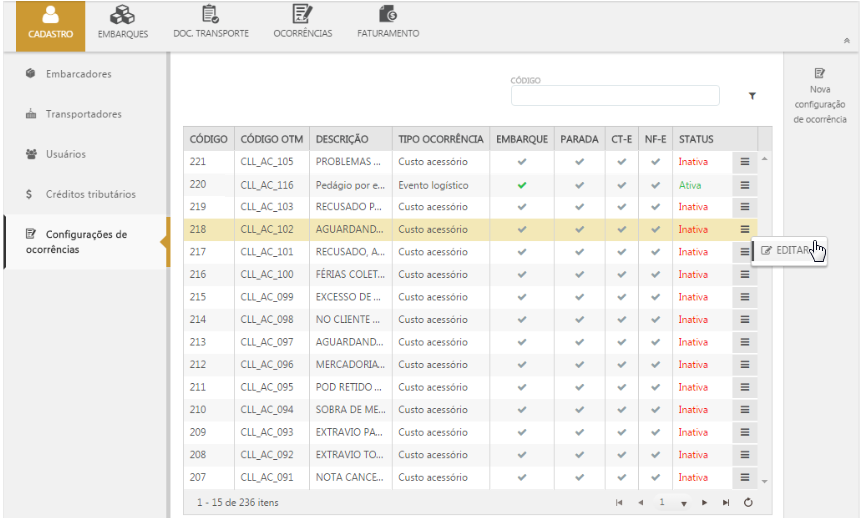 Para editar as configurações de uma ocorrência, ou ativar uma das previamente cadastradas, deve ser acessado a tela com a lista das ocorrências cadastradas em Configurações de Ocorrências e através do menu em cada registro, Editar a ocorrência desejada.
