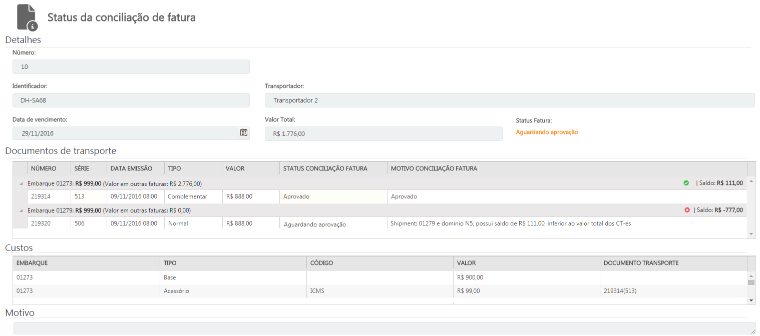 •Aguardando aprovação: Informa que o valor da fatura (soma do valor a receber dos CT-es normais que estão na fatura) é maior que o valor do shipment e a diferença precisa ser aprovada;