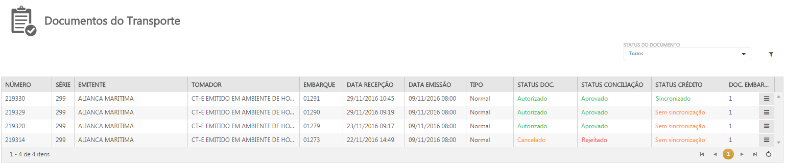 •Rejeitado: Este status será apresentado quando a fatura for rejeitada manualmente ou quando enviada para a Localização via upload ou Web Service, onde o documento é validado. Quando a fatura é gerada via tela, pelo embarcador, os dados apresentados já estão filtrados de modo a evitar a rejeição do documento.