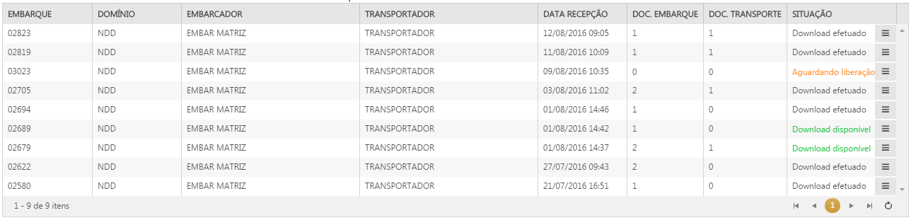 Através dessa tela pode-se acompanhar o fluxo do processo de transporte até o download dos documentos de embarque pelo transportador, através das seguintes situações: