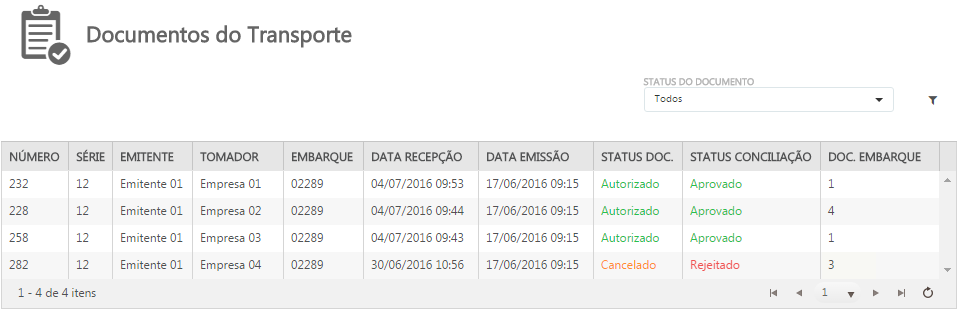 Nessa tela são apresentados todos os embarques que foram recebidos e processados com sucesso, apresentando também o transportador referenciado no shipment, além da quantidade de NF-es e CT-es vinculados à cada embarque.