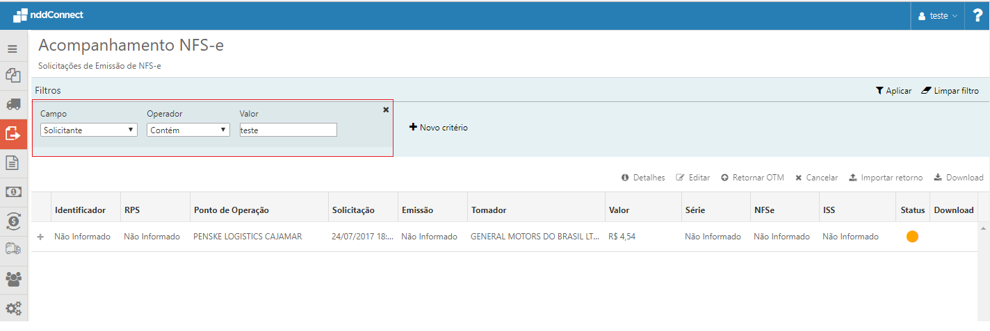 Incluído na tela de acompanhamento de NFS-e, a opção de filtrar pelo solicitante da emissão, levando em consideração, para o valor, o usuário de login do portal.